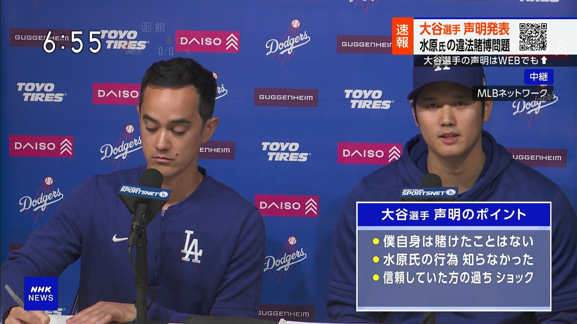 ドジャース・大谷翔平投手は25日午後2時45分(日本時間26日6時45分)、水原一平通訳が違法賭博問題で解雇された件に関して、声明文を発表した。大谷は通訳同伴で「僕も話しかったので嬉しく思っている。関係者の皆さんもファンの皆さんも厳しい一週間だったと思うが、皆さんも含めて我慢していただいてありがたいと思っている。僕自身も信頼していた方の過ちというのを、悲しくショックです」と切り出し、「現在進行中の調査もあるので、今日話せることに限りがあるのをご理解してほしく、ここにまとめたメモがあるので、何があったか説明したい」と伝えた。続けて、「僕自身、何かに賭けたり、スポーツイベントに賭けたり、頼んだこともないですし、送金を依頼したこともありません」とし、「数日前まで、彼がそうしていたことも知りませんでした。結論から言うと、彼が口座からお金を盗んで、僕の周り、みんなにうそをついていた」と語った。(Yahoo)