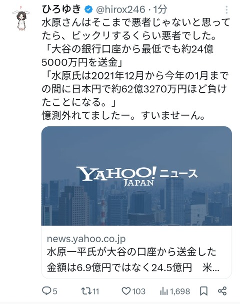 さらに、29日には自身のXで、《おいらは大谷翔平・水原氏の信頼関係は崩れてない派です。大谷氏は水原氏の違法賭博の借金を男気で肩代わりし大谷氏自ら送金↓だが、違法賭博に送金すると大リーグの規約違反と気づく↓水原氏が窃盗した事にして回避しようと言い分が変わる↓実際には水原氏は大谷氏を騙して送金してはいない。》と主張していた。