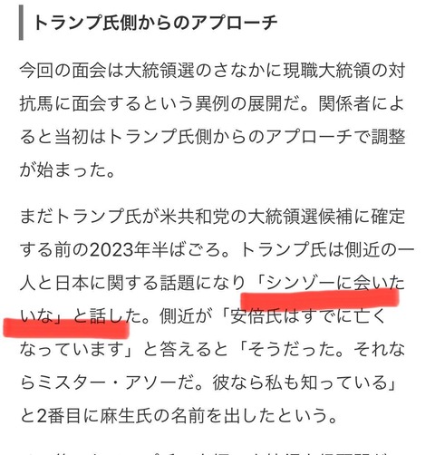 【悲報】トランプ「シンゾーに会いたいな」側近「既に亡くなっています」トランプ「そうだった」