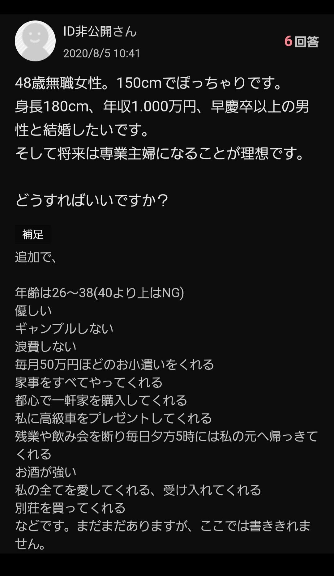 【画像】婚活女性(48歳)の男性に求める条件がこちらw w w w w w