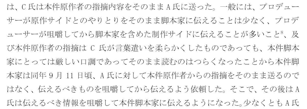 本件原作者の指摘は C 氏(編集)が言葉遣いを柔らかくしたものであっても、本件脚本家にとっては厳しい口調であってそのまま読むのはつらくなったことから本件脚本家は同年 9 月 11 日頃、A 氏(プロデューサー)に対して本件原作者からの指摘をそのまま送るのではなく、伝えるべきものを咀嚼してから伝えるよう依頼した。