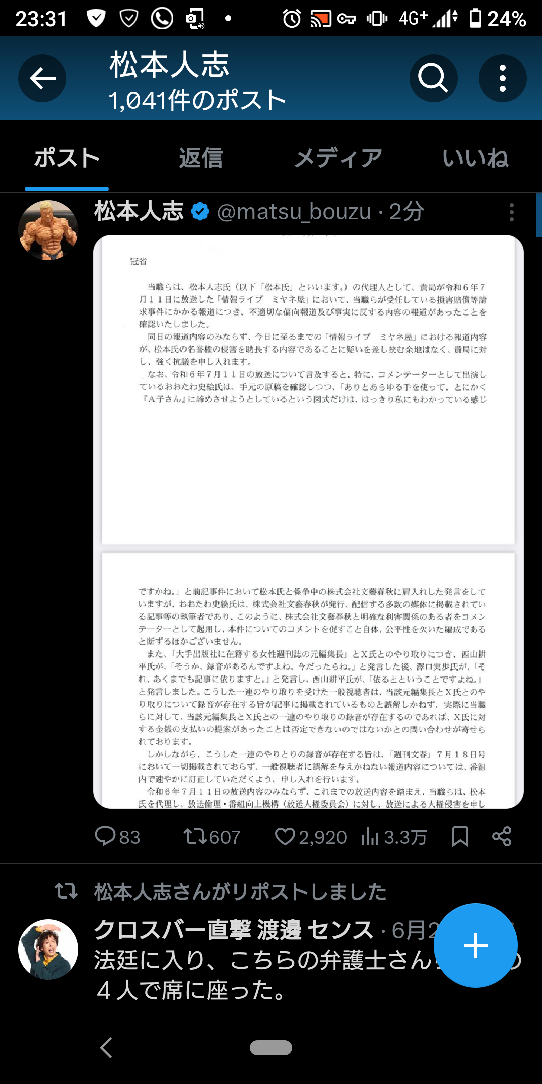 Xには抗議文が貼り付けられているだけで、松本自身の“肉声”はゼロ。Xでは松本こうした対応を非難する声が出ている。