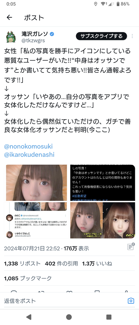 ホーム > ニュースetc > 自分を女化した画像をあげただけのおっさん、似過ぎてた女がいちゃもんをつけて炎上wwwwwwwww 2024/07/22 1:それでも動く名無し:2024/07/22(月) 00:16:46.99 ID:QuTyXEG90.net 続きを読む Source: ラビット速報 - ニュースetc