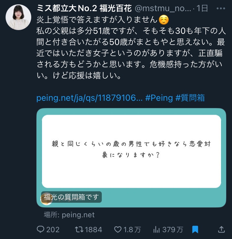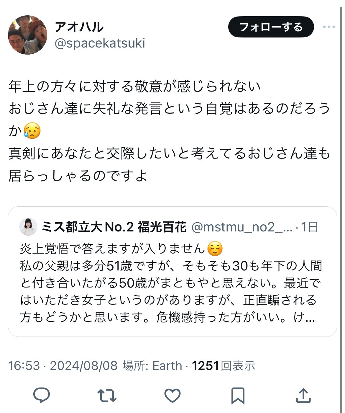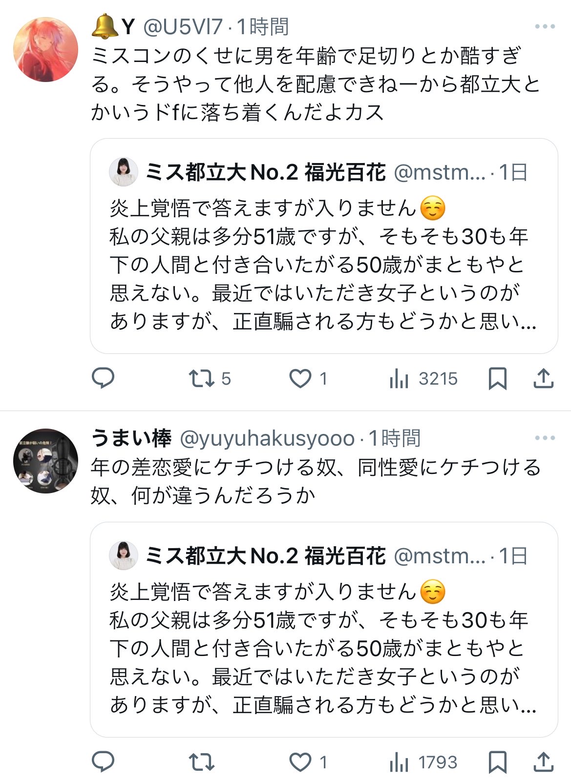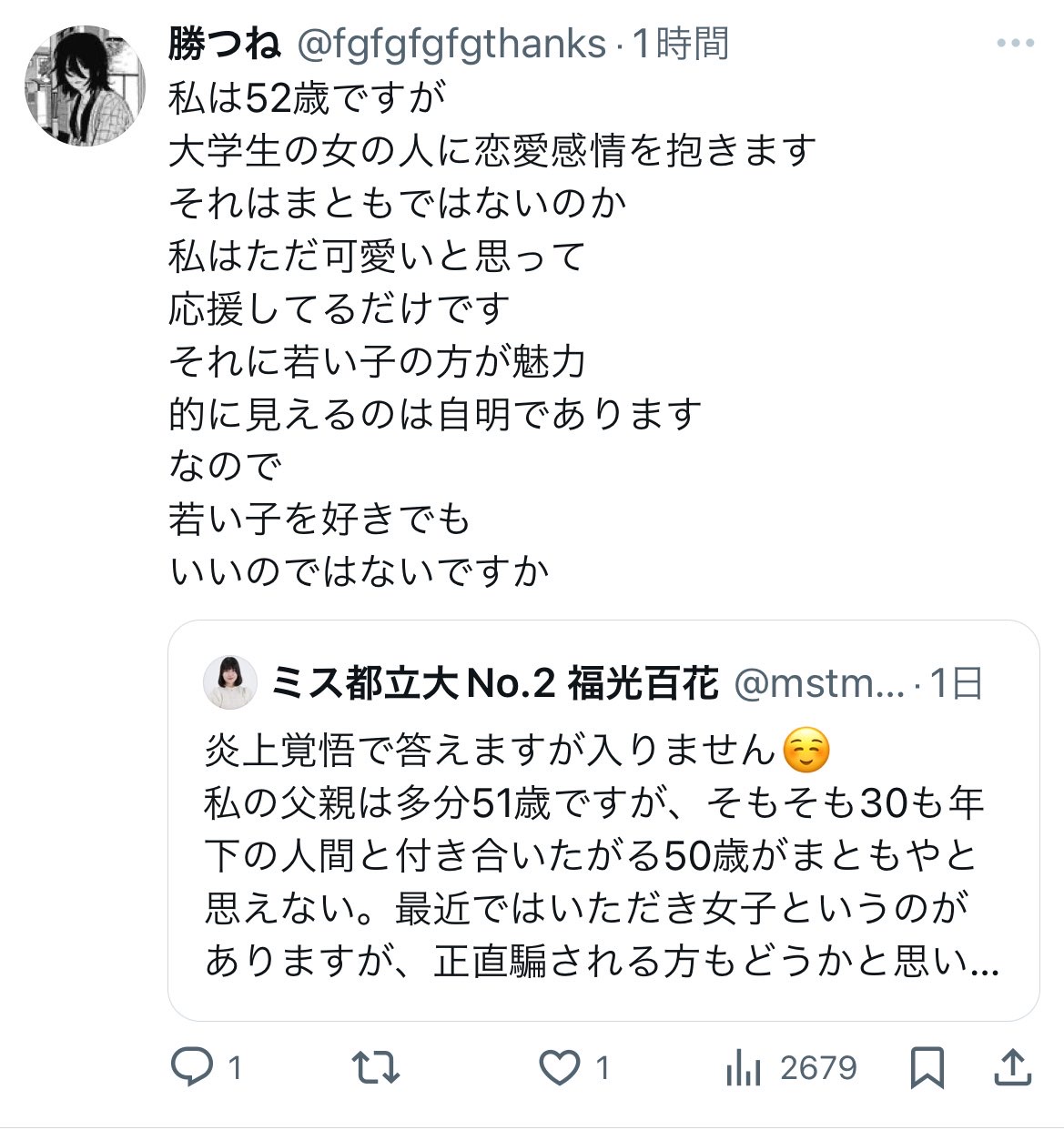 ホーム > ニュースetc > 【悲報】ミス都立大No.2「30歳も下の女と付き合いたがる男はまともではない」 無事炎上へwwwwwwwww 2024/08/09 1:それでも動く名無し 警備員[Lv.17]:2024/08/09(金) 09:11:06.11 ID:Quqo695O0 2:それでも動く名無し 警備員[Lv.1][新芽]:2024/08/09(金) 09:15:39.30 ID:jpb0Nfrs0 きもいおっさんたちだなぁ 続きを読む Source: ラビット速報 - ニュースetc
