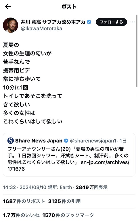 女さん「汗臭い男嫌い!」元大王製紙会長「ふーん、俺は生理臭い女嫌い!」←1.7万いいね