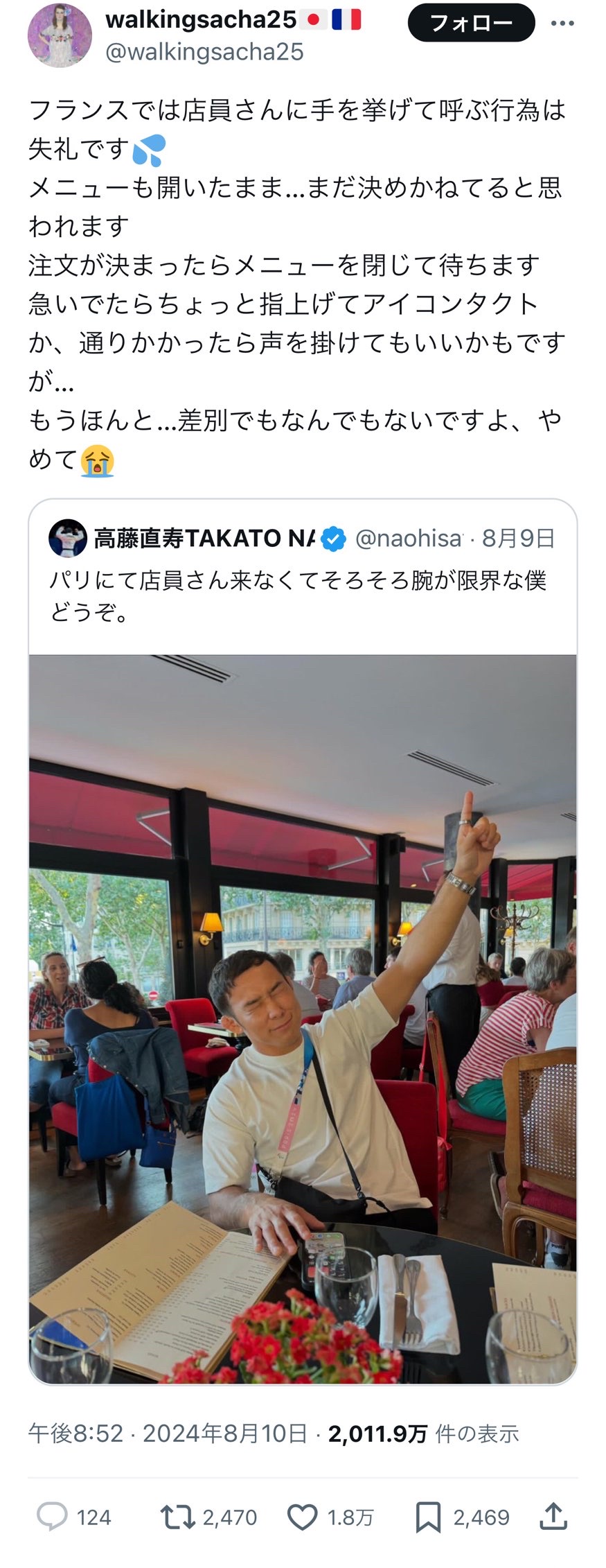 【悲報】日本人アスリート「店員が注文取りに来ない」普通の日本人「差別ですね。抗議しましょう」