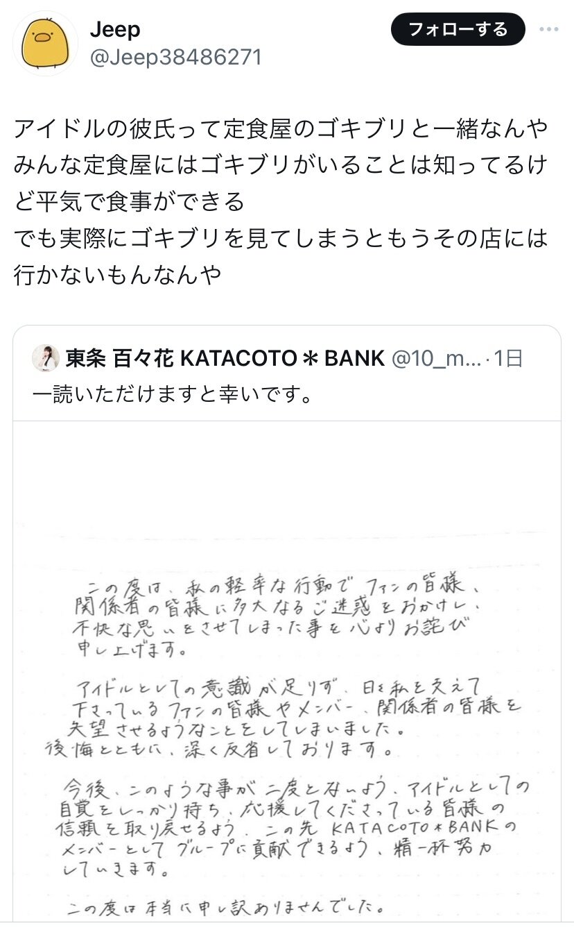 【画像】弱者男性「アイドルの彼氏って定食屋のゴキブリと一緒」→1万いいね