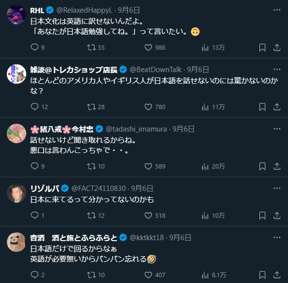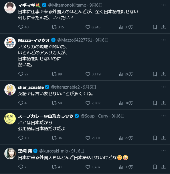 ホーム > ニュースetc > 【悲報】外国人「日本人のほとんどが英語を喋れないことに驚いた。先進国でしょ?」👈日本人大激怒で4.4万良くないねw 2024/09/11 1: 以下、?ちゃんねるからVIPがお送りします 2024/09/07(土) 20:52:33.606 ID:+YoXuTfF0.net 続きを読む Source: 妹はVIPPER - ニュースetc