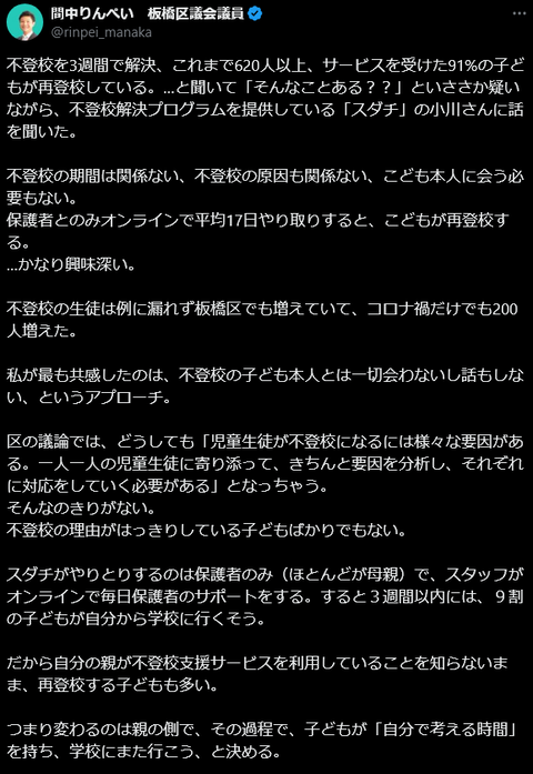 不登校を3週間で解決、これまで620人以上、サービスを受けた91%の子どもが再登校している。…と聞いて「そんなことある??」といささか疑いながら、不登校解決プログラムを提供している「スダチ」の小川さんに話を聞いた。… pic.twitter.com/HLWUtHljxt