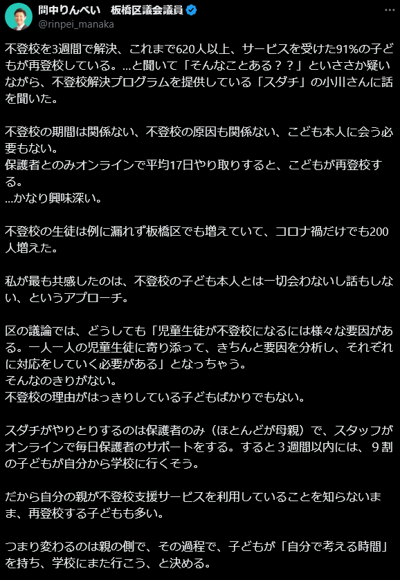 不登校を3週間で解決、これまで620人以上、サービスを受けた91%の子どもが再登校している。…と聞いて「そんなことある??」といささか疑いながら、不登校解決プログラムを提供している「スダチ」の小川さんに話を聞いた。… pic.twitter.com/HLWUtHljxt