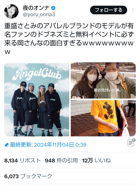 ホーム > ニュースetc > 【画像】タレントの重盛さとみさん、自身のアパレルブランドのモデルに自身のヲタを起用wwwwwwwwww 2024/11/05 1:以下、?ちゃんねるからVIPがお送りします:2024/11/04(月) 21:21:34.474 ID:lVbIRamm0.net 続きを読む Source: ラビット速報 - ニュースetc