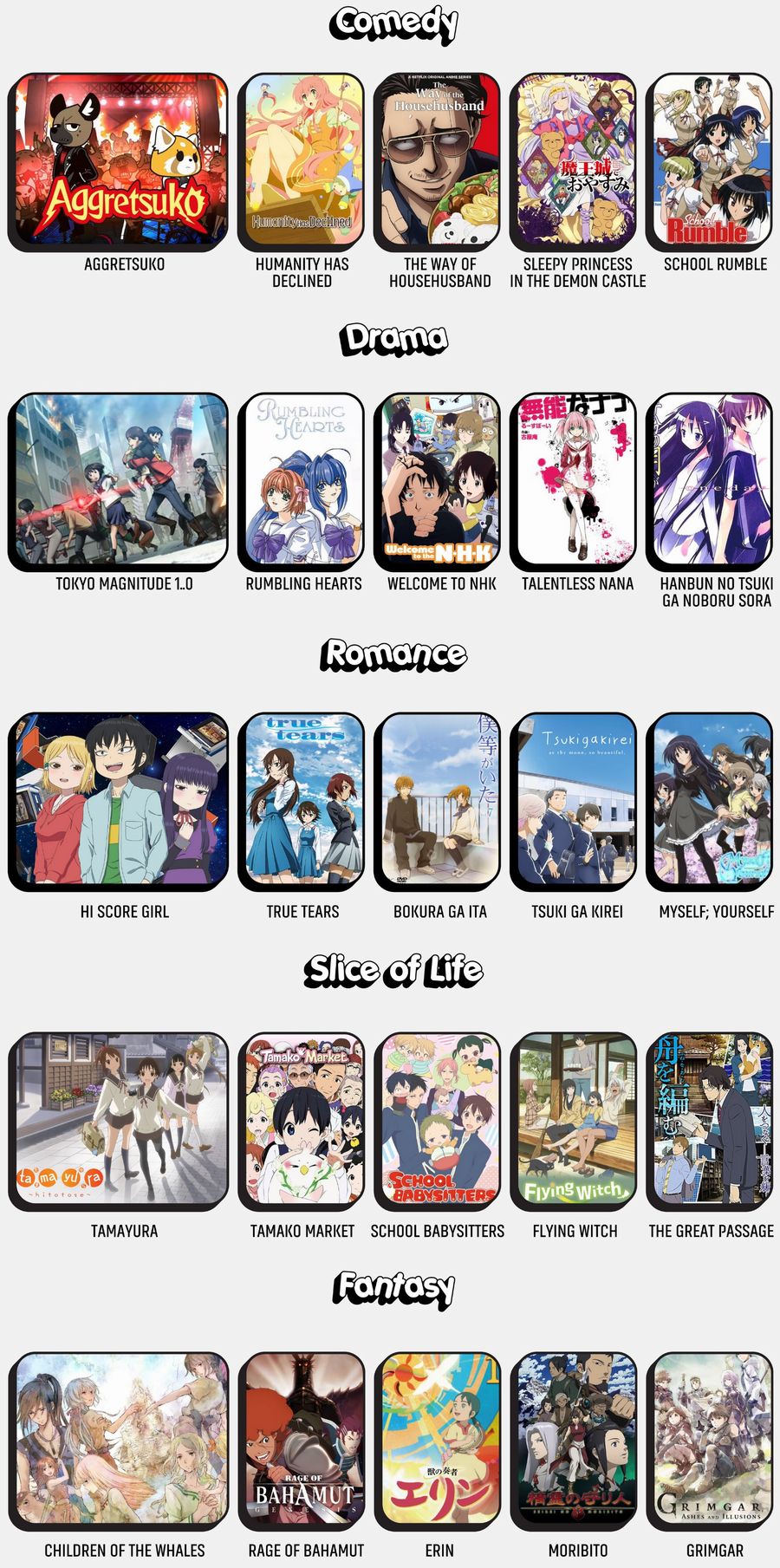 ドラマチック:東京マグニチュード8.0、君が望む永遠、NHKにようこそ、無能なナナ、半分の月がのぼる空