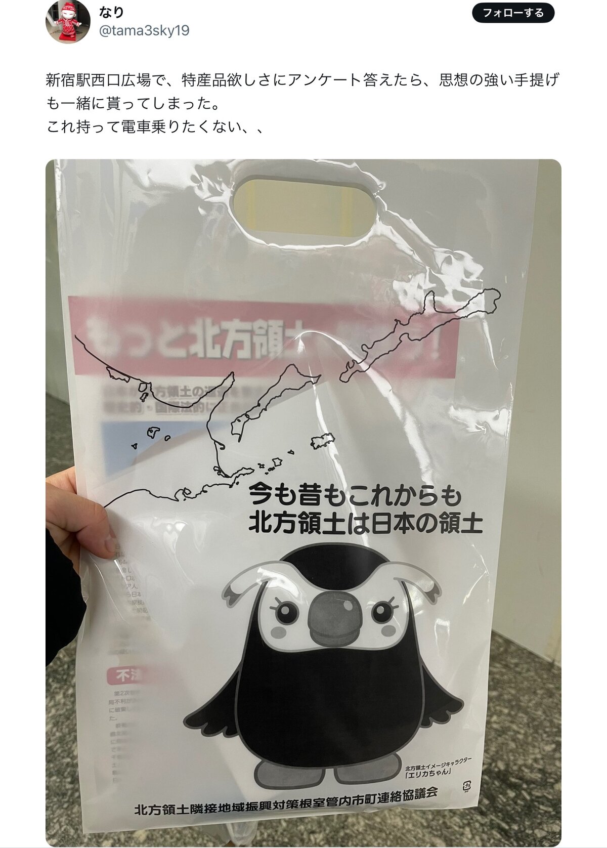 【画像】まんさん「え、待って新宿駅でアンケート答えたらめちゃくちゃ思想強い手提げ貰ってしまった これで電車乗りたくない」パシャ